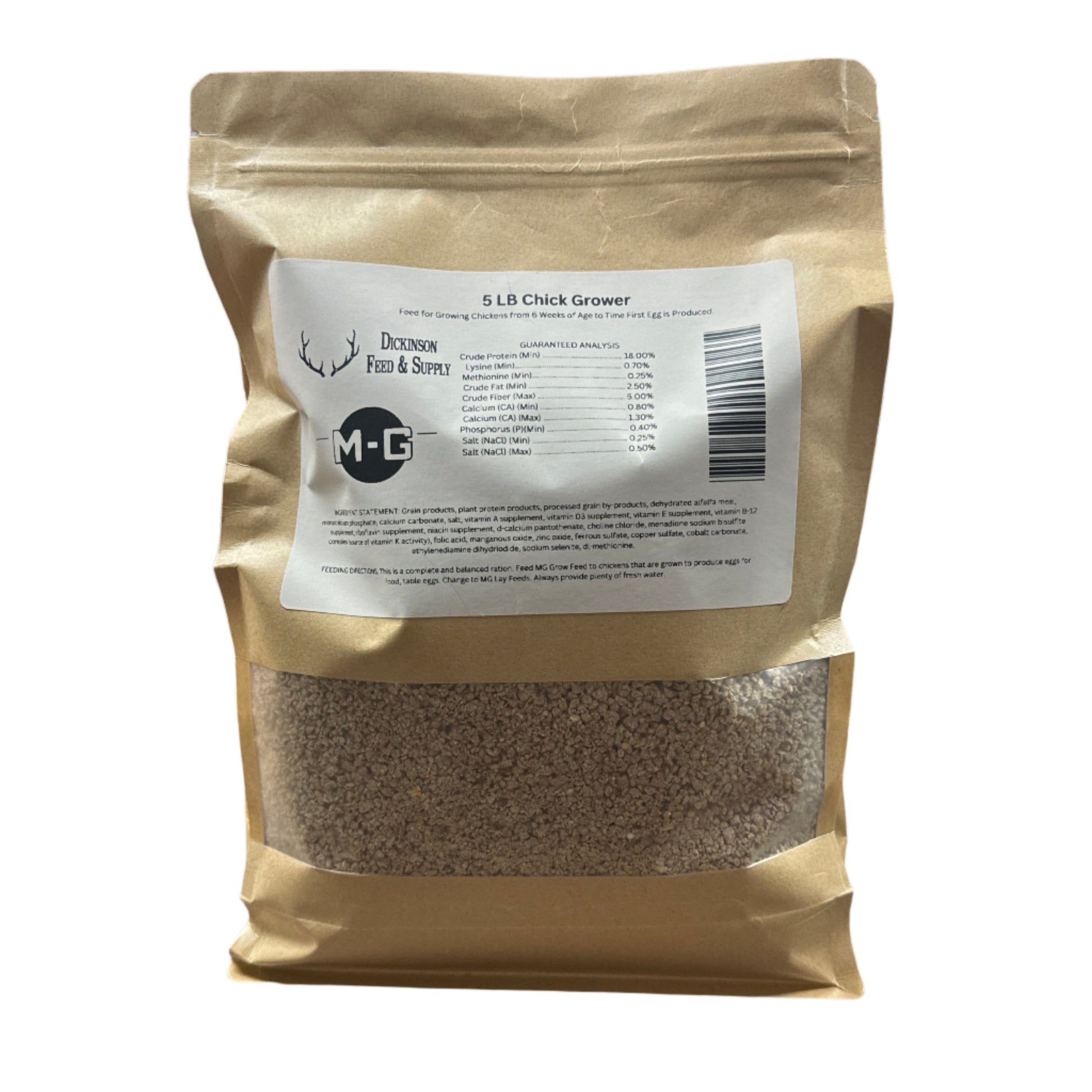 FEEDING DIRECTIONS: This is a complete and balanced ration. Feed MG Grow Feed to chickens that are grown to produce eggs for food, table eggs. Change to MG Lay Feeds. Always provide plenty of fresh water.